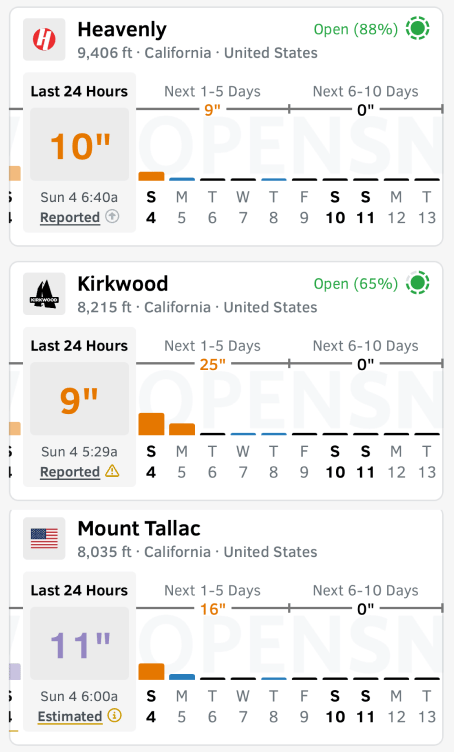 10” and 12” of snow in the last 24 hours at Heavenly and Kirkwood, respectively, and more overnight.